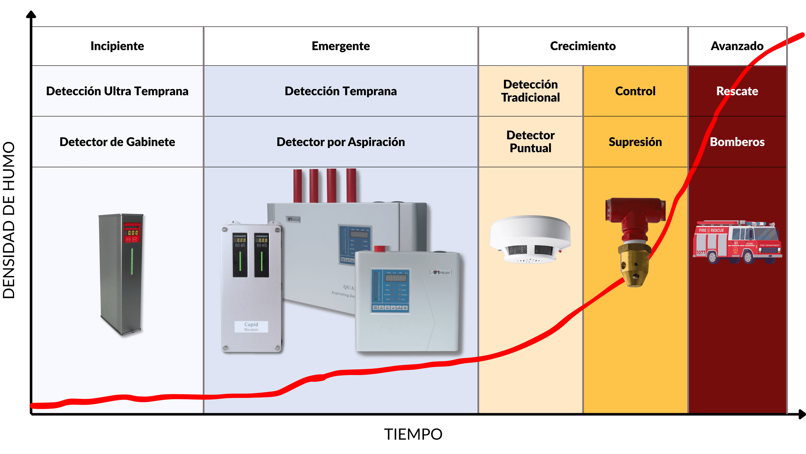 Aspiration detectors trigger alarms in the early stages or fire development, much before the fire starts. This allows us to act proactively and avoid having to react and control a potential fire. The time graph below shows the detection and control stages of fire protection.
