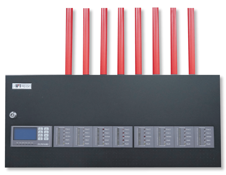 The AVA FANFARE is the first real multi-zone early warning aspiration detector for protecting large and very large enclosures.  This detector was designed with large enclosures in mind. Engineering for the protection of spaces where traditional detection is difficult to install and maintain. The focus is to bring early warning smoke detection technology out of its traditional uses, such as data centers, into other critical infrastructure like airports, malls, and warehouses. The FANFARE ranges from 4 to 8 fully separate and independent zones, each equipped with its own sensor chamber, aspirator, and monitoring display.